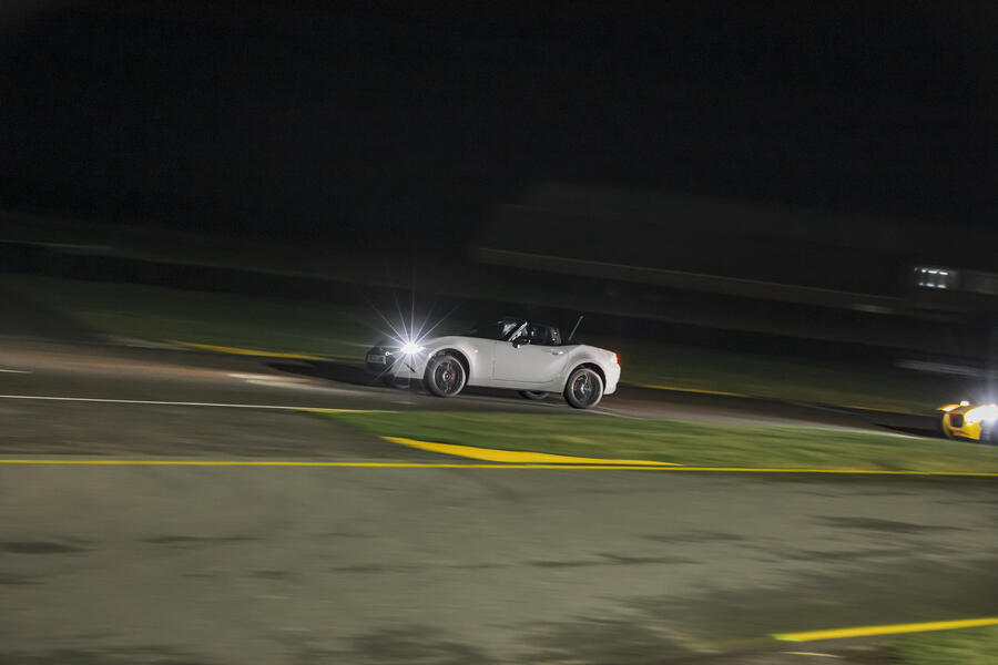 I am pedaling my Mazda MX-5 as fast as I dare. In front of me is almost perfect darkness.