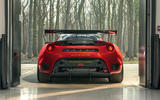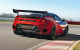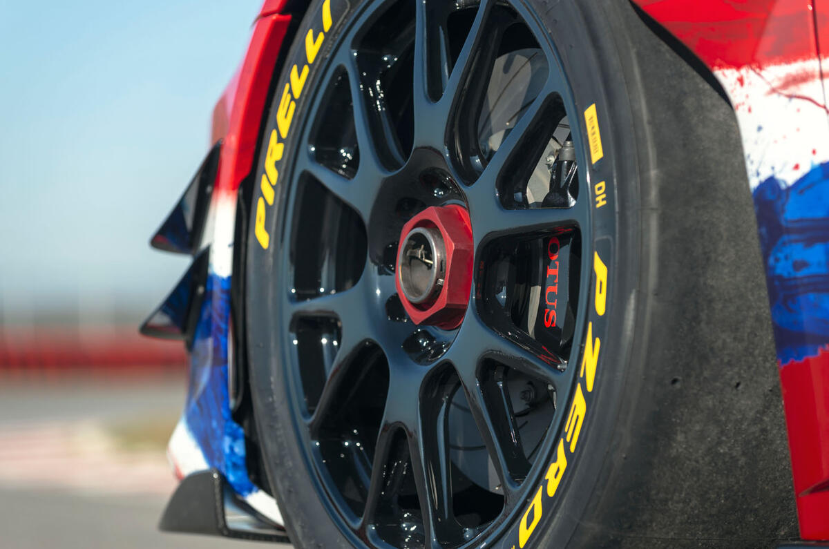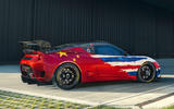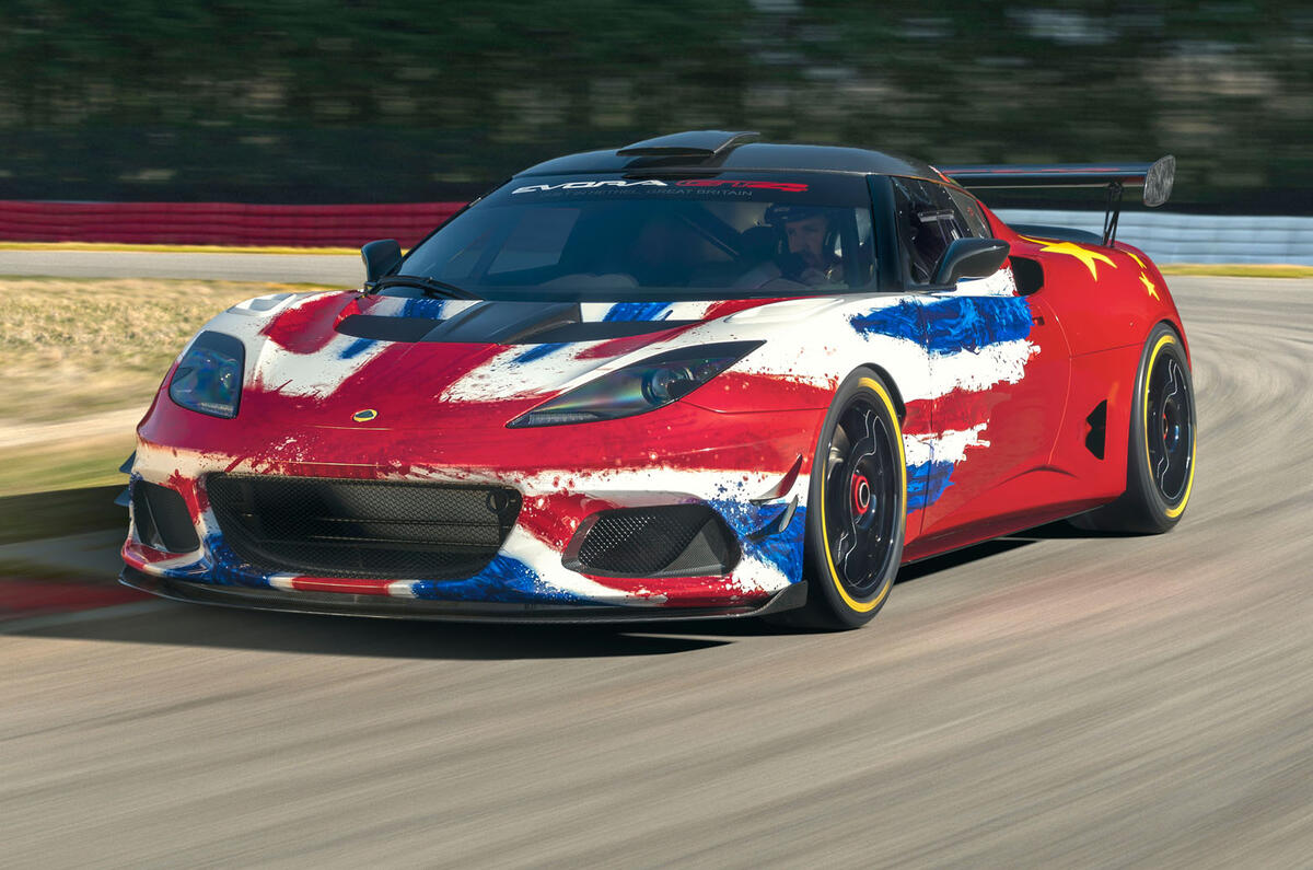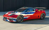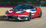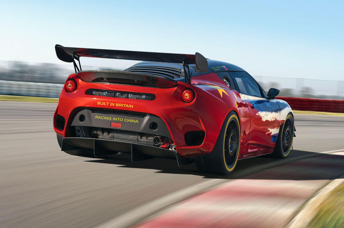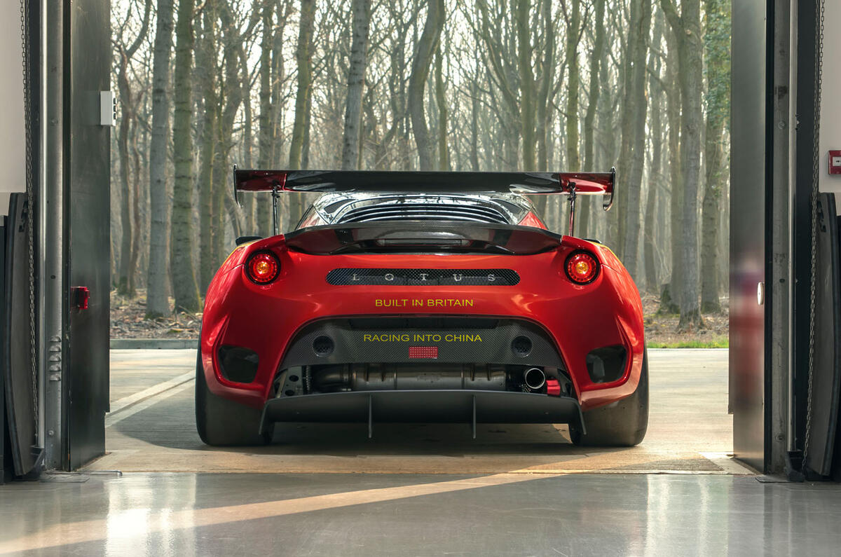 Sitting on race-spec centre-lock wheels shod with slick tyres, the Evora GT4 sports an adjustable rear wing, a roof-mounted carbonfibre air intake and aerodynamics-enhancing louvres on the front wings.