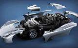 The Stradale project has had a two-decade gestation. The project was paused several times as engineering effort was switched to projects for external clients. The finished car uses a central carbonfibre tub with aluminium subframes at each end, although the front suspension is mounted directly to the tub. The bodywork is all carbon.