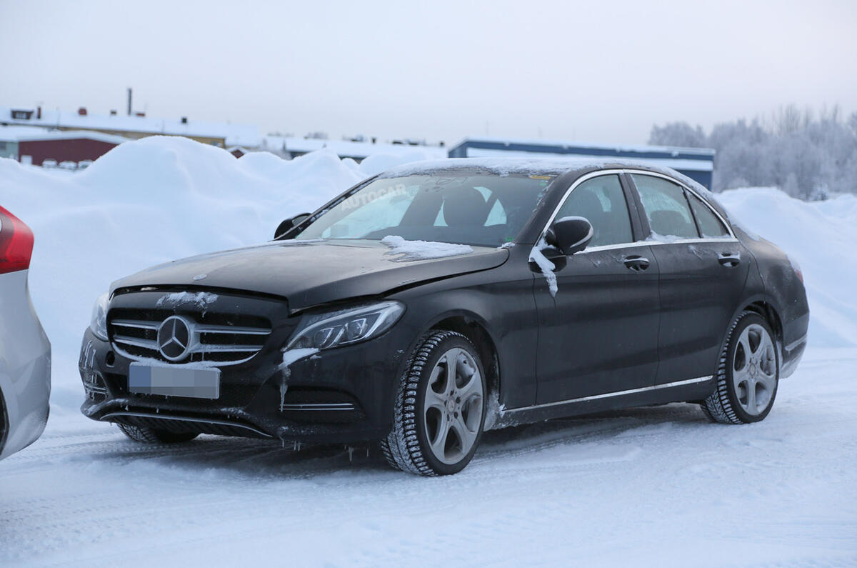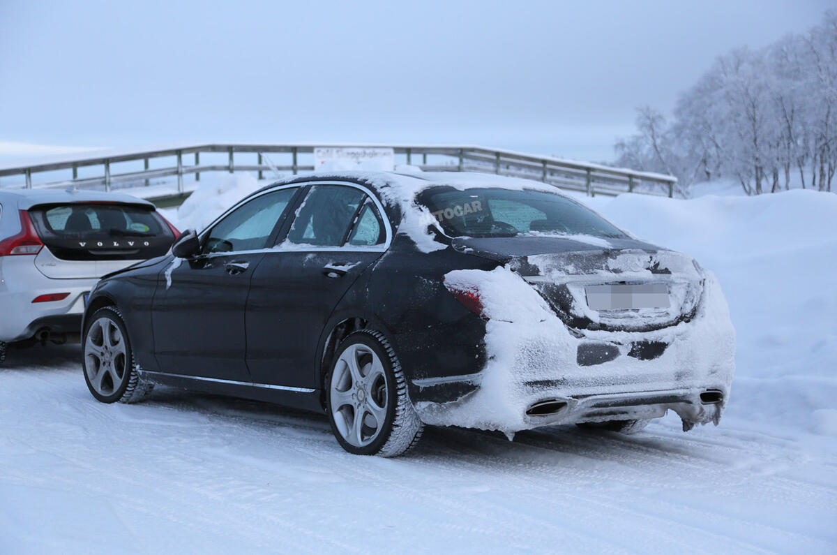 It’s thought the prototype C-Class caught winter testing in Scandinavia is undergoing proving trials to ensure that the car’s exterior sensors work as well as possible in severe weather, such a very low temperatures and with snow being thrown up by the vehicle ahead.