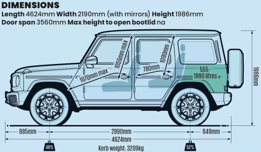 The relatively shallow boot, at 555 litres, is down a little on ICE G-Class models owing to a marginally taller floor, but the rear seats fold flat. This, along with the very high ceiling, makes the G-Class as capacious as any other senior SUV.